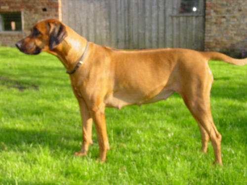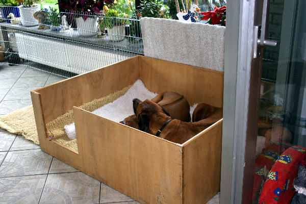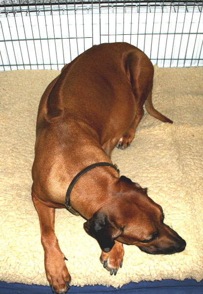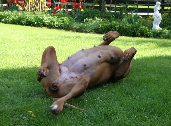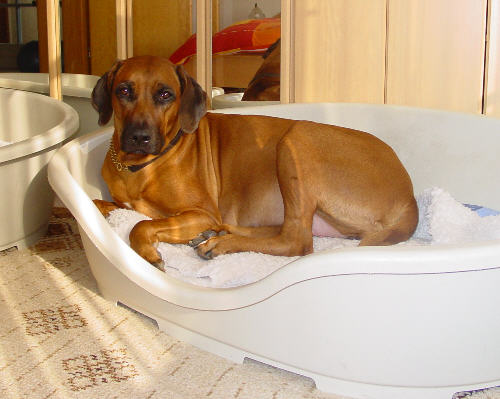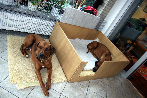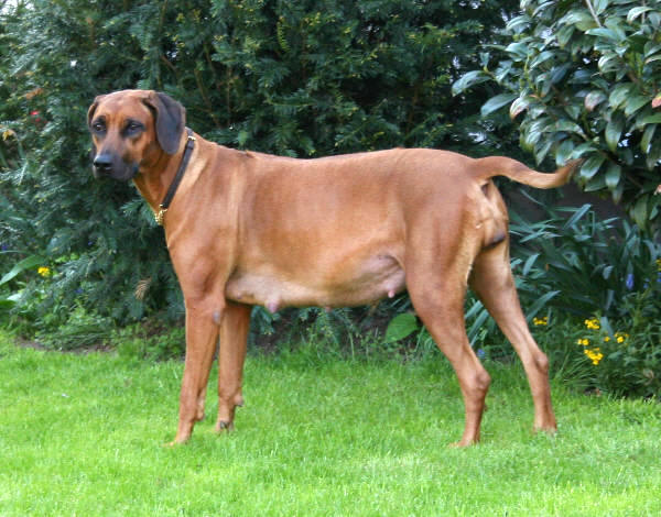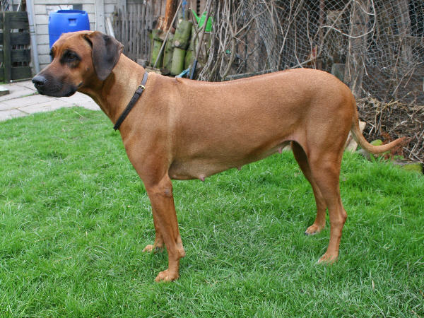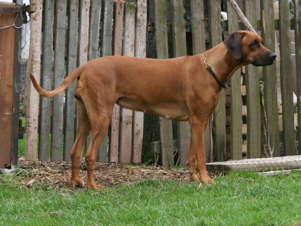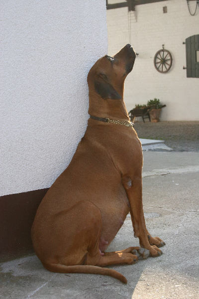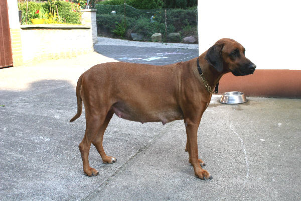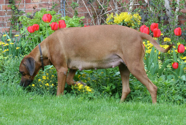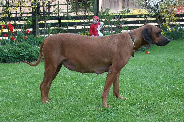 18. April 2006 - 40. Tag Thani ist hier am 40. Tag der Trächtigkeit. Sie verhällt sich typisch für eine tragende Hündin. Sie sucht sich bereits ein geeignetes Plätzchen um sich eine Höhle zu graben, ist sehr verschmust und anhänglich, aber stets gut gelaunt.